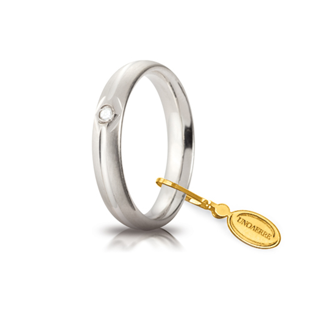 Fede nuziale Comoda UNOAERRE in oro bianco 750 con finitura satinata e diamante di taglio brillante ct. 0,03. Fede bombata liscia. Un anello unico e prezioso, un cerchio perfetto che non si interrompe mai. La tenuta del colore è garantita da un ulteriore trattamento di cataforesi che ne preserva la lucentezza. Queste fedi sono verificate in conformità ai più restrittivi standard europei (ReaCH) ed internazionali sull’assenza di sostanze non consentite o allergene. Il prodotto è 100% Made in Italy.